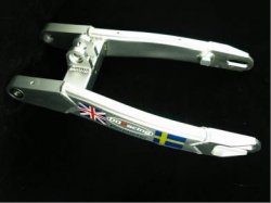 Zadní kyvná celohliníková vidlice, uložení v ložiskách samozřejmostíVysokopevnostní hliník, poloviční váha oproti standardní ocelové kyvce 410mm délkaM10 kuličková závodní ložiskaM15 oska zadního kolaM10 úchyt zadního tlumiče